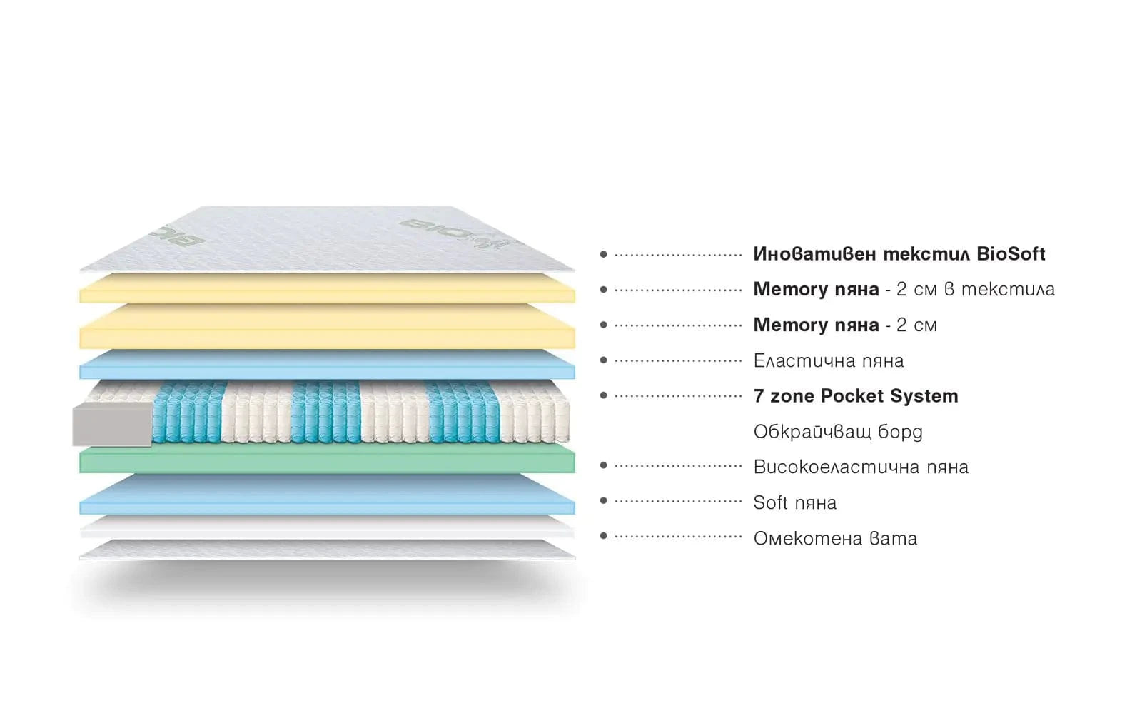 Насладете се на релаксиращ и възстановяващ сън с BioSoft – иновативен модел матрак, който комбинира предимствата на Pocket Spring System пружинен пакет, Memory пяна и иновативен текстил BioSoft.