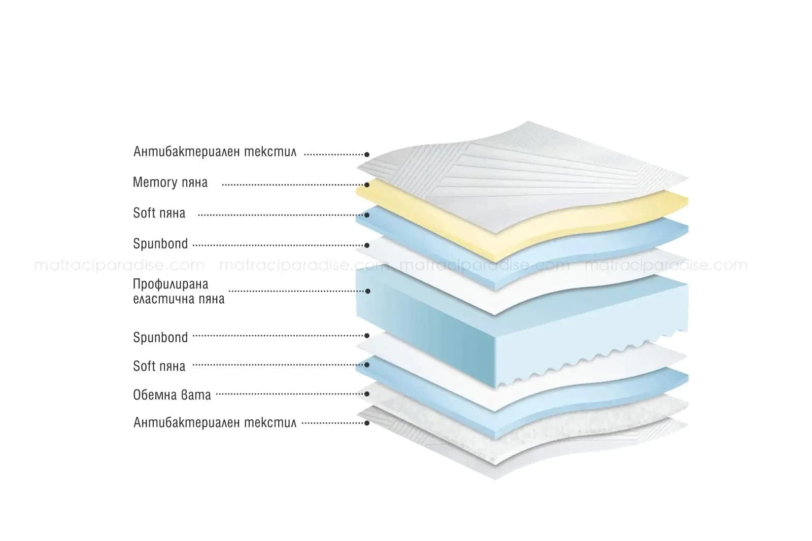 Състав на матрака: висококачествен капитониран текстил с антибактериална обработка, Memory пяна, профилирана еластична пяна