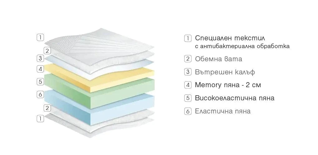 Състав на матрака: висококачествен капитониран текстил с антибактериална обработка, Memory пяна, високоеластична пяна, еластична пяна, вътрешен калъф, цип