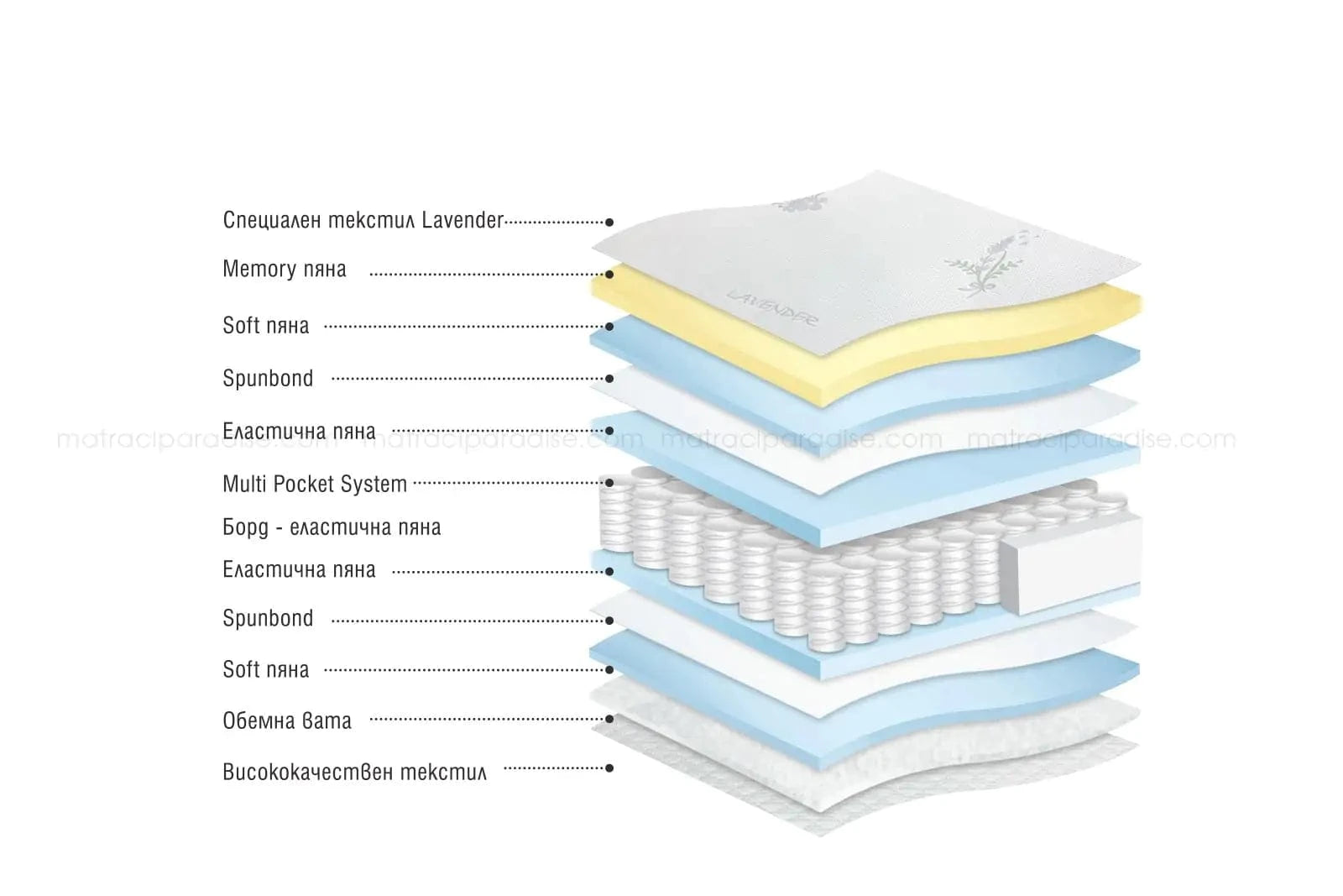 Състав на матрака: Специален текстил Lavender, Memory пяна в прошивката, еластична пяна, Pocket System, полиуретанов борд