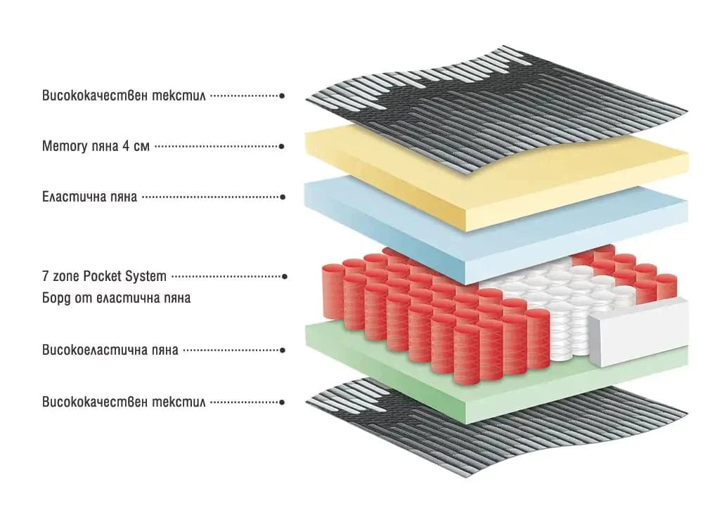 Състав на матрака: висококачествен текстил,  7 зонов Pocket System, Memory пяна, високоеластична пяна, еластична пяна