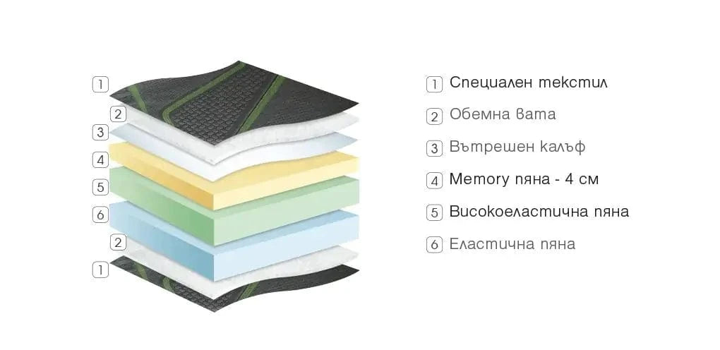Състав на матрака: висококачествен капитониран текстил, Memory пяна, високоеластична пяна, еластична пяна, вътрешен калъф, цип
