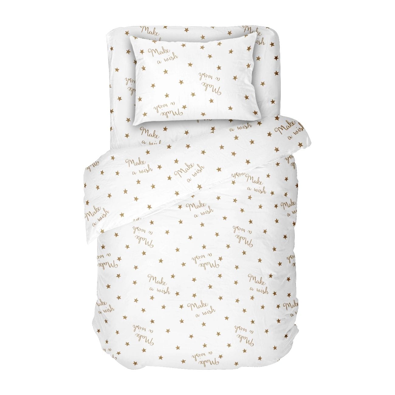 - Нежен десен в бял цвят, комбиниран с фини звездички и надписи. Освен красив десен, комплектът притежава високо качество. Материята Ранфорс е мека и устойчива, като задържа топлината през зимата и не запарва през лятото.