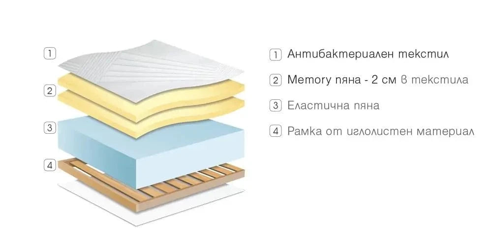 Състав на матрака: висококачествен капитониран текстил с антибактериална обработка, Memory пяна в прошивката, еластична пяна, рамка от иглолистен материал.