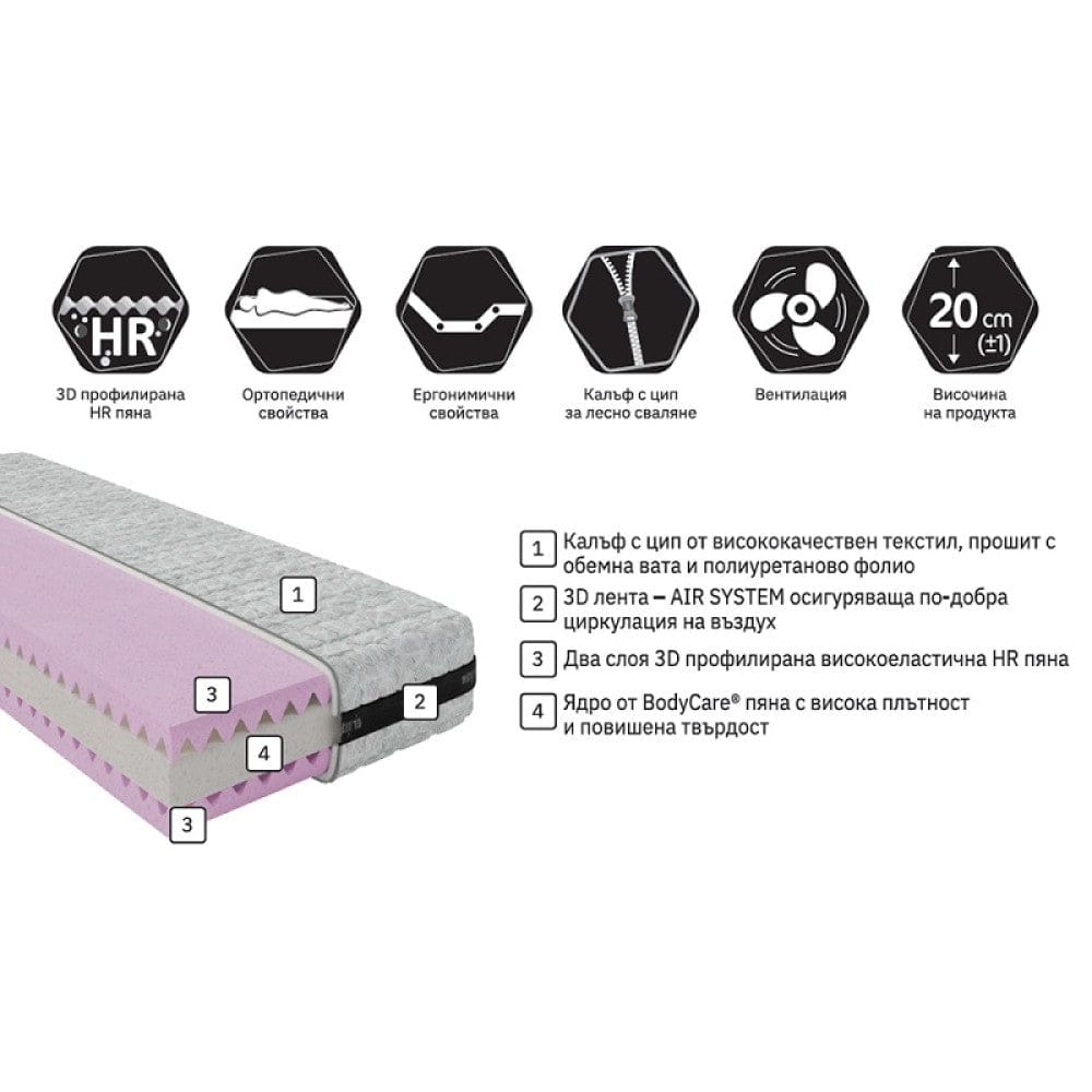 Матракът има симетрична трислойна конструкция: база от BodyCare® пяна с висока плътност и повишена твърдост, която има изразени ортопедични свойства, издръжлива е на натиск, натоварване и деформация и се грижи за здравата и стабилна опора на гръбначния стълб.