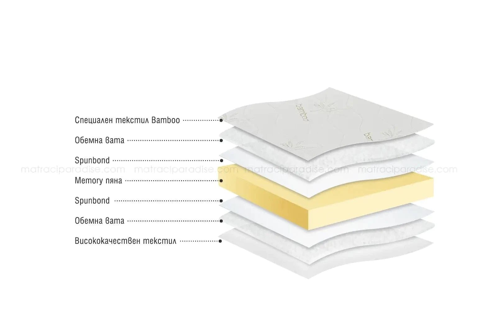 Топер Бамбу Мемо е направен от изцяло от Memory пяна. Memory пяната реагира на топлината на тялото и заема формата на всяка негова извивка. От едната страна на ядрото има капитониран специален текстил Bamboo, а от другата - капитониран висококачествен текстил.