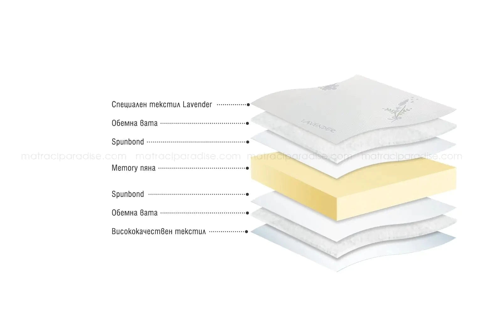 Ядрото на топер Лавенда Мемори е изцяло от Memory пяна. Memory пяната реагира на топлината на тялото и заема формата на всяка негова извивка. От едната страна на ядрото има капитониран специален текстил Lavender с аромат на лавандула, а от другата - капитониран висококачествен текстил.