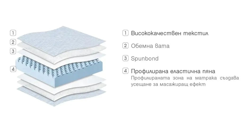 Състав на топ матрака: висококачествен капитониран текстил, профилирана еластична пяна, цип