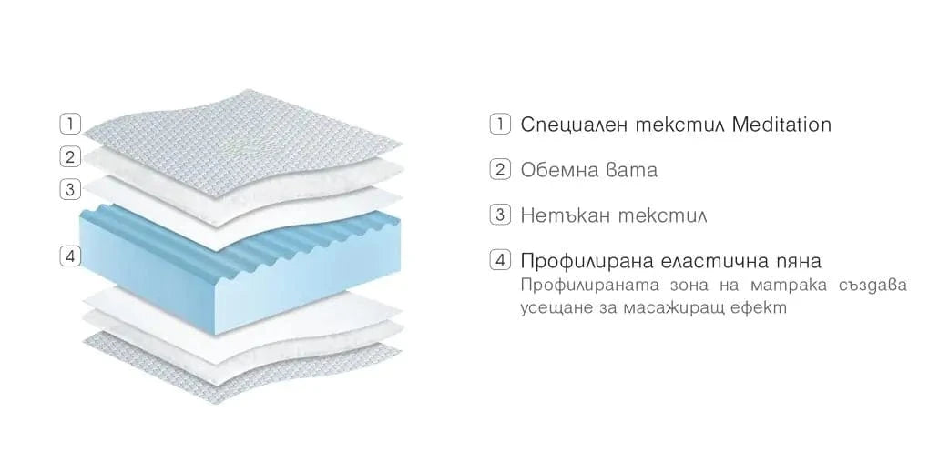 Ядрото на Топ матрак Медитейшън е направено от едностранно профилирана еластична пяна, която не се деформира. Профилираната зона на топ матрака създава усещане за естествен пружиниращ и масажиращ ефект. Допринася за по-добрата вентилация и естествено самопроветряване на топ матрака.