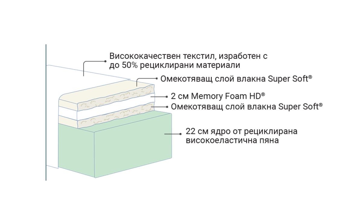 Ядрото от ортопедична пяна със съдържание на рециклирани до първична суровина материали предоставя правилна опора за тялото по време на сън, като предотвратява изкривяването и намалява риска от болка и дискомфорт.