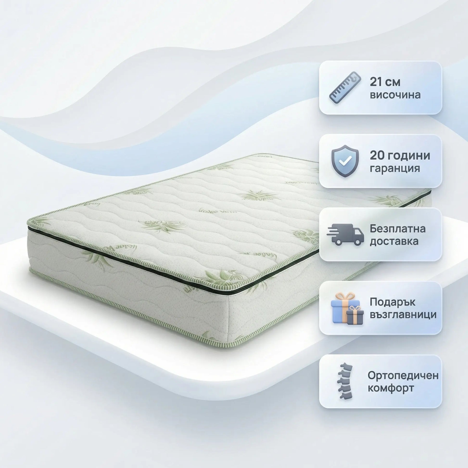 Матрак Алое Вера съчетава комфорт и стабилна опора за спокоен и възстановяващ сън. Средната твърдост и трислойната конструкция го правят подходящ за повечето хора и всички позиции на спане.